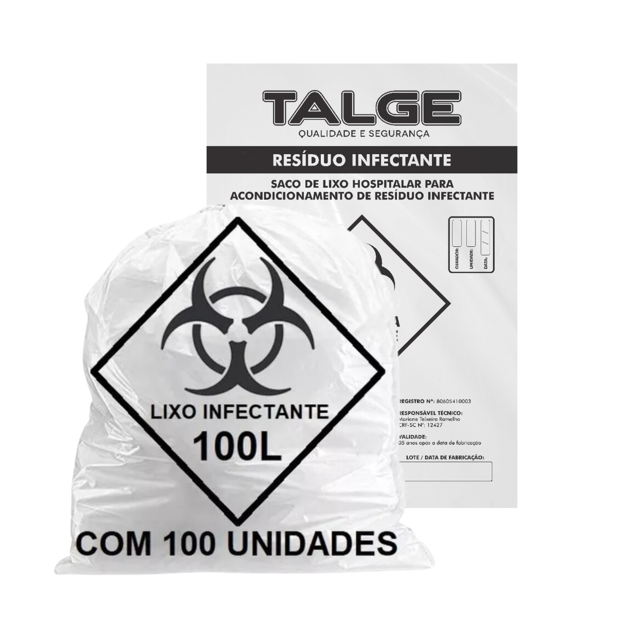 Sacos de lixo plásticos para acondicionamento de resíduos e substâncias infectantes e rejeitos produzidos em estabelecimentos de saúde, como hospitais, clínicas veterinárias, pronto-socorros, unidades de pronto atendimento, consultórios odontológicos, centros de pesquisas, laboratórios farmacêuticos e procedimentos médicos. Produto de Uso único.