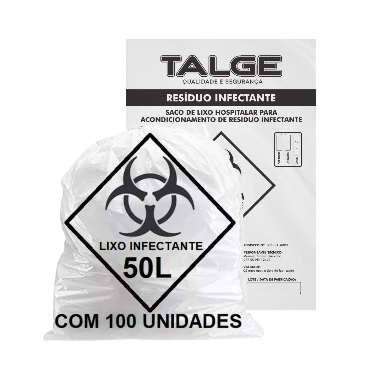 Sacos de lixo plásticos para acondicionamento de resíduos e substâncias infectantes e rejeitos produzidos em estabelecimentos de saúde, como hospitais, clínicas veterinárias, pronto-socorros, unidades de pronto atendimento, consultórios odontológicos, centros de pesquisas, laboratórios farmacêuticos e procedimentos médicos. Produto de Uso único.