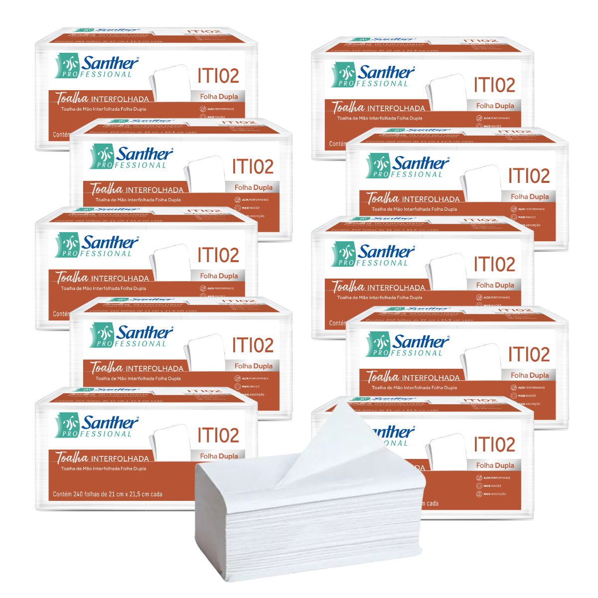 Toalha de papel interfolhada folha DUPLA - Caixa com 10 pacotes de 240 folhas simples de 21cm x 21,5cm cada - Total 2400 folhas